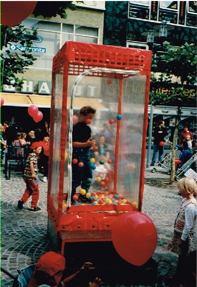 - Box, in der verschiedenfarbige Bälle durcheinander gewirbelt werden, von denen auf Zeit möglichst viele zu fangen sind